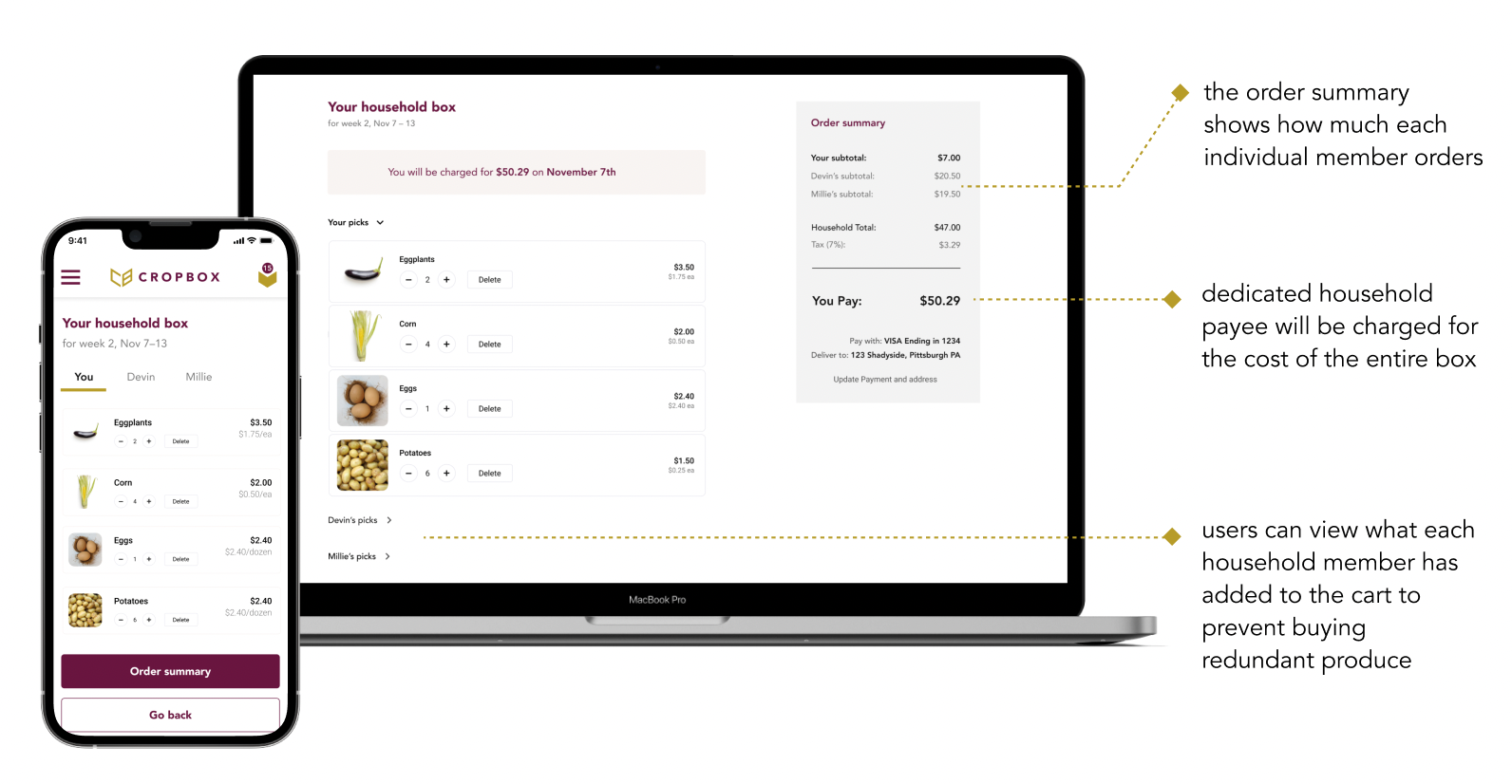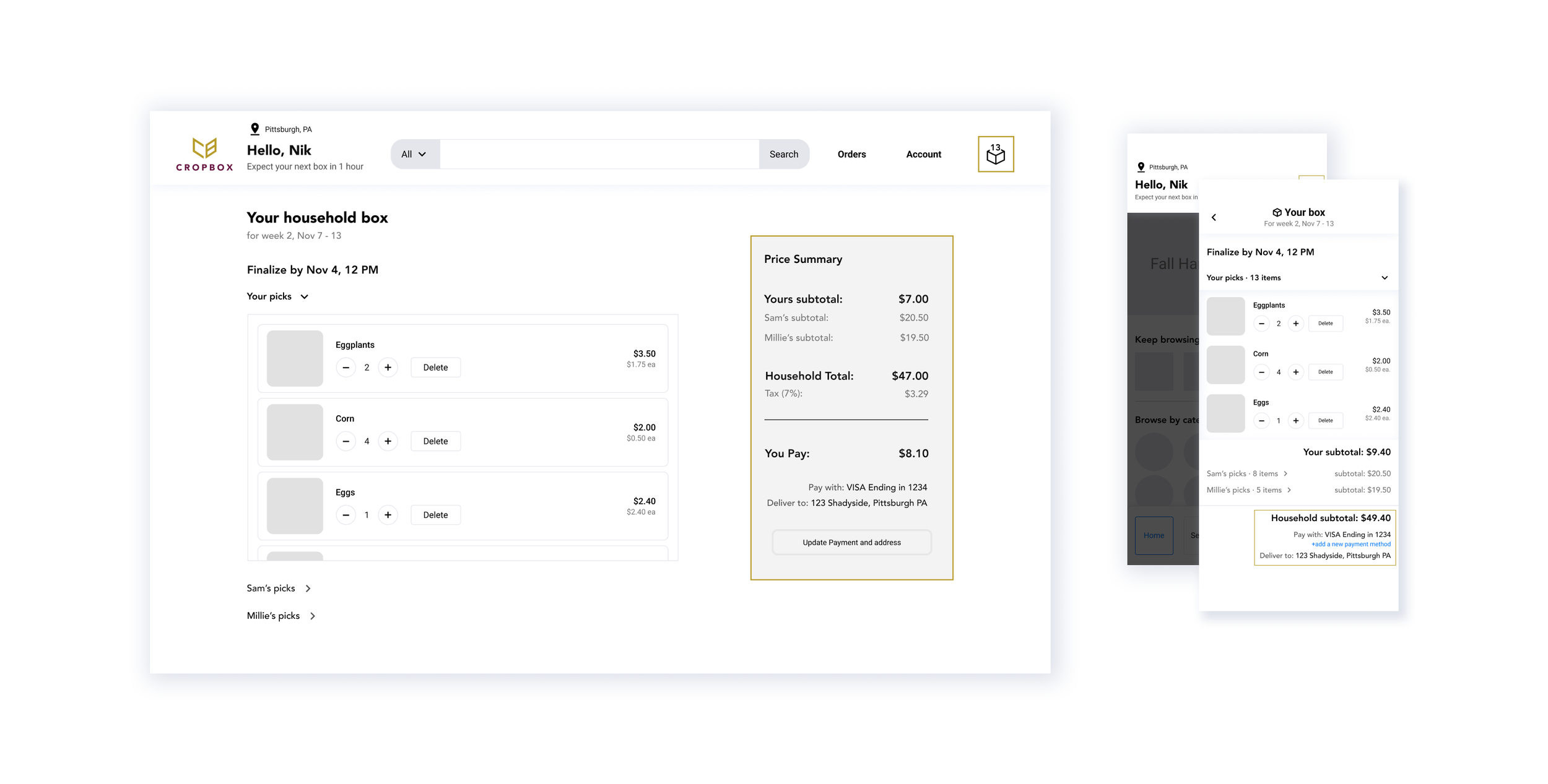 As a team, we reflected on what subscription service design means and how it could be improved to help both end-users and service providers. We decided to remove those two buttons and instead dedicate one person as the household payee who will be charged for the cost of the entire box.