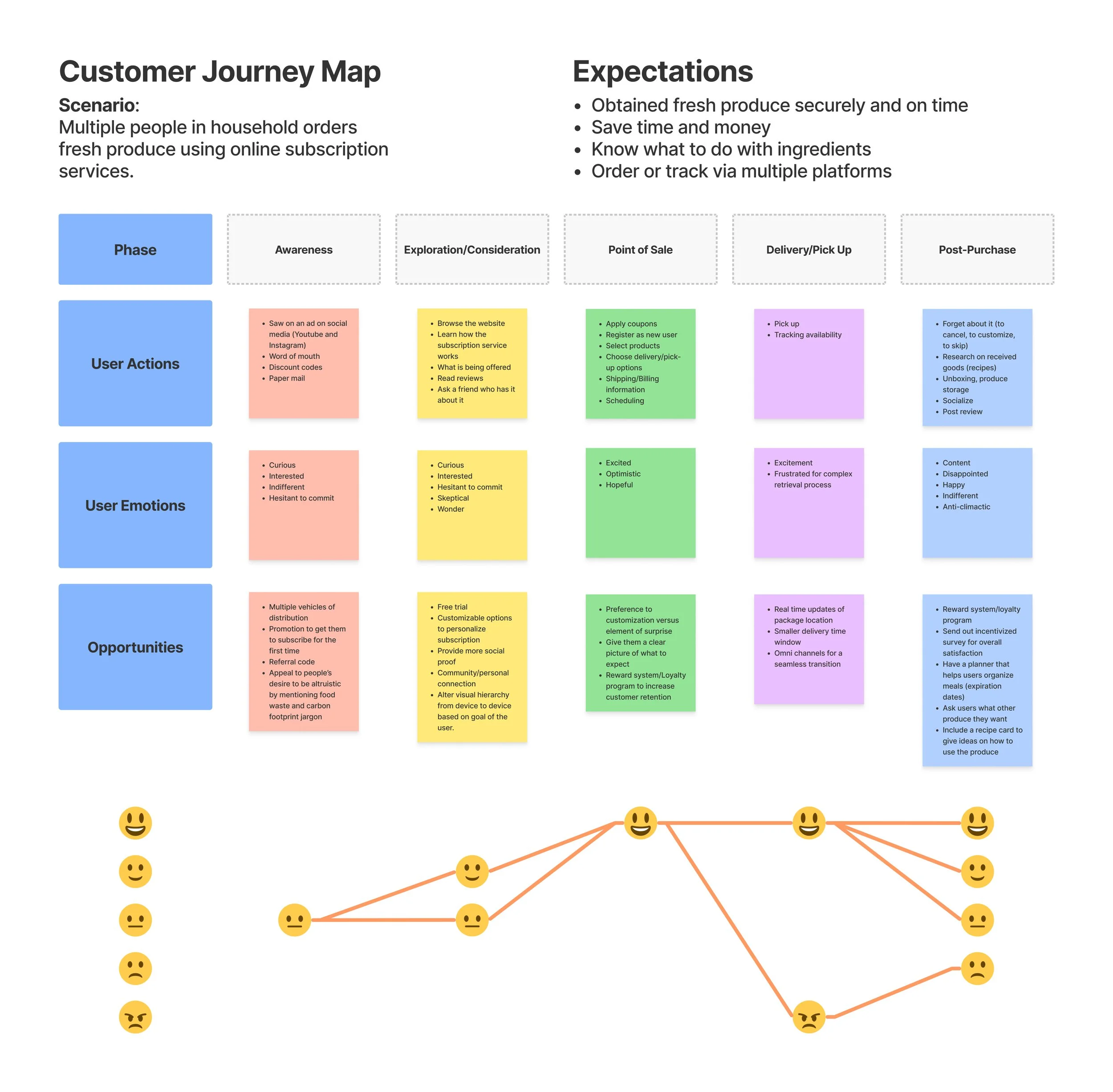 After interviewing some customers of potential competitors of CropBox, we created a combined customer journey map to assess how to improve already existing models. We identified and broke down the general service model from like-competitors into 5 phases: